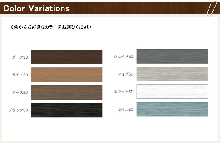アーバンフェンスUVで特に人気の高いブラウン系、ブラック&ホワイトに加え、2024年に新登場したモダンなくすみ系カラーなど昨今の住宅シーンに合わせやすい8色をご用意しました。