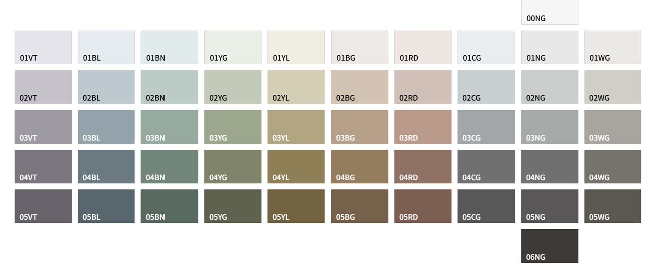 エクステリア、インテリア問わず、空間の中で優しく調和する「ニュアンスカラー」52色をご用意。