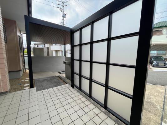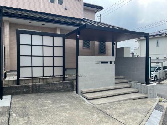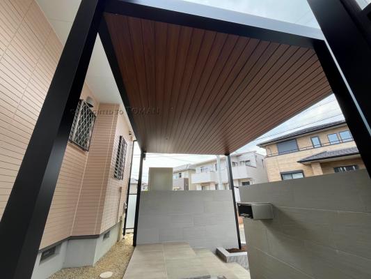 リクシルのプラスGシリーズは、Gルーフ、Gスクリーン、Gフレームを組み合わせることで、使い勝手やお好みに合わせた、自分だけのエクステリア空間を演出できるシリーズです。ダウンライトを仕込んだGルーフをエントランスルーフとして取り入れ、高級感のある外構に仕上がりました。