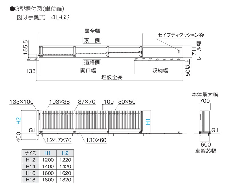 通常の引戸門扉の場合、本体パネルをそのままスライドさせるため、収納スペースも含めた施工に必要な間口が本体パネル間口の倍以上になることもありますが、