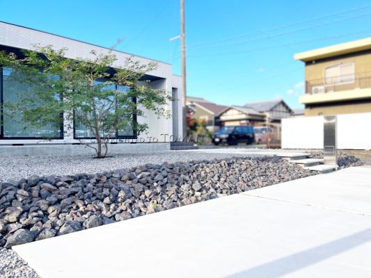 駐車場からGLにかけての高低差は濃いグレーのぐり石で法面に仕上げました。広い敷地を活かして緩やかな傾斜にしたことで”ゆとり”のある雰囲気が感じられます。