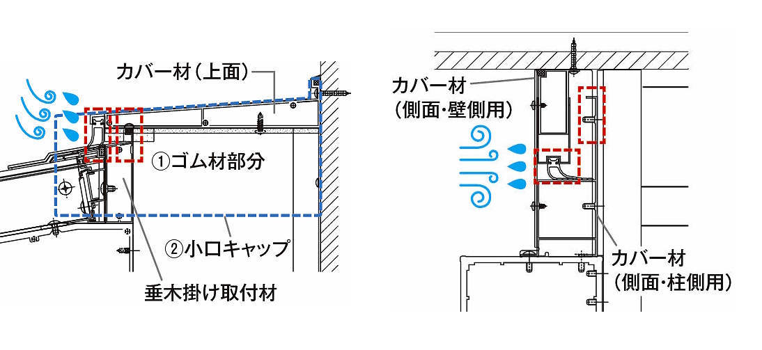 構造に工夫を施し、テラス囲い内部への雨水侵入リスクを低減しています。