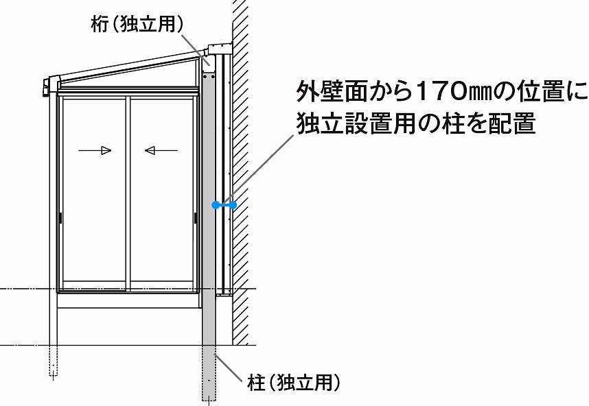 独立用柱を住宅外壁よりも前方に設置し、住宅基礎との干渉回避に配慮しました。
