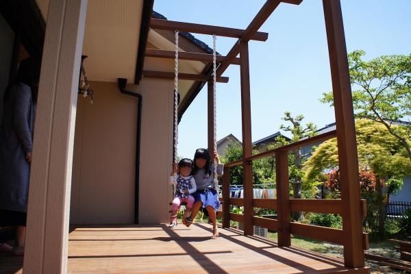 ウリンパーゴラを一体型で施工し、パーゴラにブランコを取り付けました。お子様にとっても、とても楽しい遊び場となりそうです。